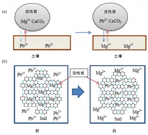 ¡¡¡¡Í¼3£º(a)»îÐÔÌ¿ÖеÄMg2+ÓëÍÁÈÀÖÐPb2+µÄÀë×Ó½»»»¹ý³ÌºÍ(b)ǦÎÛȾÍÁÈÀÖеÄÀë×Ó½»»»¡£