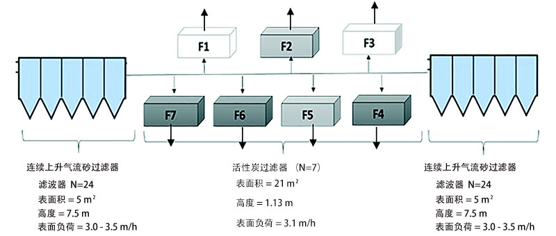 ¡¡¡¡Í¼1£ºÁ¬ÐøÉÏÁ÷ɰÂËÆ÷ºÍ»îÐÔ̿ƽÐÐÏÂÓιýÂËÆ÷µÄʾÒâͼ¡£Éî»ÒÉ«¿ò(F4£¬F6ºÍF7)ÊǾ¹ý¸ÄÔìµÄ»îÐÔÌ¿¹ýÂËϵͳ£¬Ç³»ÒÉ«¿ò(Rf2ºÍRf5)ÊÇδ¸ÄÔì²Î¿¼»îÐÔÌ¿¡£´æÔÚ¸½¼Ó¹ýÂËÆ÷(F1ºÍF3)¡£