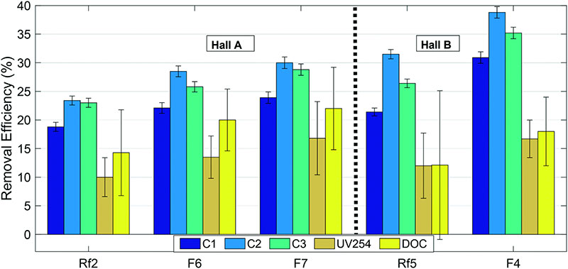¡¡¡¡Í¼2£º¸ÄÔìºóµÄ(F6£¬F7ºÍF4)ºÍ²Î¿¼(Rf2ºÍRf5)¹ýÂËÆ÷ÖлîÐÔÌ¿¶ÔÓлúÎï¼¶·ÖµÄÈ¥³ýЧÂÊ¡£Îó²î°ô±íʾͨ¹ýÎó²î´«²¥¼ÆËãµÄ±ê×¼Îó²î(N=4)¡£