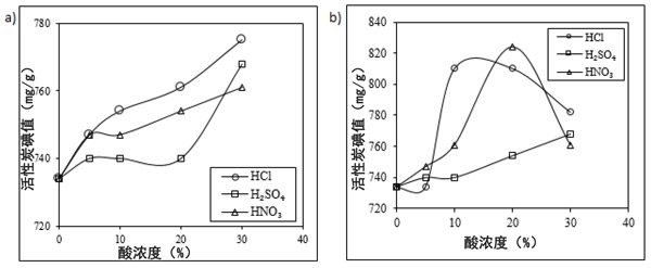 ¡¡¡¡Í¼1£ºËáµÄŨ¶È¶Ô»îÐÔÌ¿µâÖµµÄÓ°Ï죬ÔÚ(a)18°CºÍ(b)50°CϽøÐÐËáÏ´»¯Ñ§»î»¯¡£