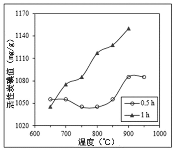 ¡¡¡¡Í¼2£º»î»¯Ê±¼ä(0.5ºÍ1h)¶ÔÓÃH 2 SO 4(ÔÚ50°CÏÂ30%v / v)Ï´µÓµÄ·Ï»îÐÔÌ¿µÄµâÖµ(mg I 2/g»îÐÔÌ¿)µÄÓ°ÏìÔÚ²»Í¬Î¶È(650°CÖÁ950°C)ÏÂÖØÐ»¡£