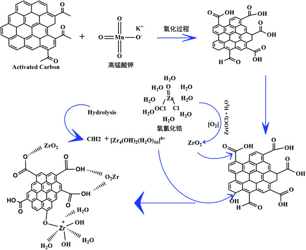 ¡¡¡¡ÒѾ¿ªÊ¼¶Ô´ÖÖÆ»îÐÔÌ¿½øÐиÄÐÔ£¬ÒÔÈ·±£±íÃæ±ØÐë¾ßÓпÉÇÖÊ´Ä¿±êÒõÀë×ÓÎÛȾÎïµÄÑôÀë×Ó¶ÔÓ¦ÎΪ´Ë£¬ÒѶ¨ÒåµÄ·½·¨ÒѾÊÊÓ¦¿ª·¢¶ÔÒõÀë×ÓȾÁϾßÓиü¸ßÎü¸½Ç׺ÍÁ¦µÄвÄÁÏ¡£ÏÔÓ°²ÄÁϵĿÉÄܵķ´Ó¦»úÀíÒÑÔÚͼ1Öиø³ö¡£Ê×ÏÈ£¬ÒѾÓøßÃÌËá¼ØÈÜÒºÑõ»¯ÁË»îÐÔÌ¿µÄ±íÃæ£¬Ê¹µÃ»îÐÔÌ¿µÄ±íÃæÔö¼ÓÁËÆä¶Ô½ðÊô¶ÔÓ¦ÎïµÄÇ׺ÍÁ¦¡£ÓëKMnO 4·´Ó¦Ê±£¬»îÐÔÌ¿±íÃæÉÏ´æÔÚµÄôÊ»ù±»Ñõ»¯ÎªôÈ»ù£¬¸ÃôÈ»ù½øÒ»²½ÈÝÒ×ÓëÂÈÑõ»¯ï¯·´Ó¦¡£Ë®½âʱ£¬ÂÈÑõ»¯ï¯·Ö½â³É½Ï°µµÄÐÎʽ£¬¼´[Zr 4(OH)2(H 2 O)16 ] 8+ÓëHClºÍһЩÂÈÑõ»¯ÎïÐÎʽ¡£ÂÈÑõ»¯ÎïµÄÐÎʽ½øÒ»²½Ñõ»¯³ÉÑõ»¯ï¯(ZrO 2)£¬¶ø½Ï°µµÄÐÎʽÔòÓë»îÐÔÌ¿·´Ó¦²¢Ðγɸ´ºÏÎï¡£½«ÐγɵĹÌÌåÓÃ̼ËáÇâÄÆÈÜÒº´¦Àí£¬¸ÃÈÜÒºÊÇÁ½ÐԵģ¬Ò×ÓÚÓëÊ£ÓàµÄËáÐÔ»ùÍÅ·´Ó¦ÒÔ·ÀÖ¹½øÒ»²½µÄÂçºÏÎïÐγɡ£ÕâЩ¸ÄÐÔ¹¤ÒÕ»¹Í¨¹ý²»Í¬µÄ±íÕ÷¼¼Êõ½øÐÐÁËÑéÖ¤£¬ÕâЩ¼¼Êõ¿ÉÈ·±£ÔÚ»îÐÔÌ¿±íÃæÉÏÐγɽðÊôÑõ»¯Îï¡£