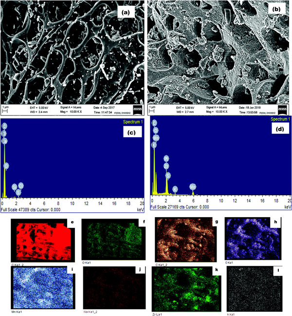 ¡¡¡¡Í¼2£º(a)»îÐÔÌ¿ºÍ(b)ÔØï¯»îÐÔÌ¿µÄ΢¹ÛÐÎ̬£¬(c)ÔʼºÍ(d)ZrACµÄEDX¹âÆ×ÒÔ¼°»îÐÔÌ¿(eºÍf)ºÍÔØï¯»îÐÔÌ¿(g–l)µÄÔªËØÍ¼¡£