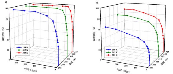 ¡¡¡¡Í¼2£ºÎü¸½Ð§ÂÊËæÊ±¼äºÍζȵı仯£º(a)Í(b)п¡£