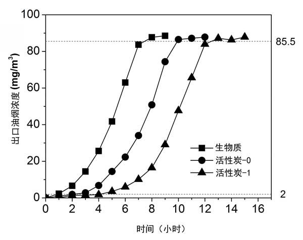 ¡¡¡¡Í¼2ÏÔʾÁËÉúÎïÖÊ¡¢»îÐÔÌ¿0ºÍ1¶ÔÅëâ¿ÓÍÑ̵ÄÎü¸½´©Í¸ÇúÏß¡£ÉúÎïÖÊ¡¢»îÐÔÌ¿0ºÍ1µÄÉøÍ¸Ê±¼ä·Ö±ðΪ0.9¡¢2.1ºÍ4.1Сʱ£¬Õâ±íÃ÷»îÐÔÌ¿1µÄ×÷ÓÃʱ¼äÔÚ±»²â²ÄÁÏÖнϳ¤¡£Åëâ¿ÓÍÑ̵ÄÉúÎïÖÊ¡¢»îÐÔÌ¿0ºÍ1µÄÎü¸½Á¿¡£Åëâ¿ÓÍÑ̵ÄÉúÎïÖÊ¡¢»îÐÔÌ¿0ºÍ1µÄÎü¸½Á¿·Ö±ðΪ6.43¡¢22.58ºÍ44.04mg/g£¬Õâ±íÃ÷»îÐÔÌ¿1µÄÎü¸½Á¿±È½Ï´ó¡£Òò´Ë£¬»îÐÔÌ¿1±íÏÖ³ö±È»îÐÔÌ¿0¸üºÃµÄÎü¸½ÐÔÄÜ¡£