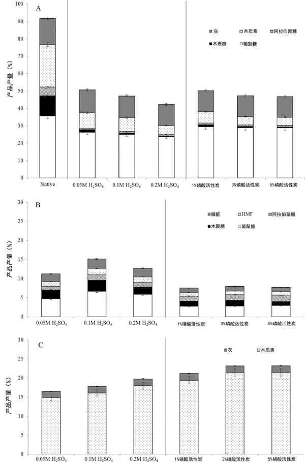 ¡¡¡¡Í¼2£ºÁ×Ëá¼ÓÈë»îÐÔÌ¿µÄŨ¶È¶ÔÉúÎïÖÊ·ÖÀëµÄÓ°Ïì(A)¹ÌÌ岿·Ö£¬(B)º¬Ë®²¿·Ö£¬(C)Óлú²¿·Ö¡£