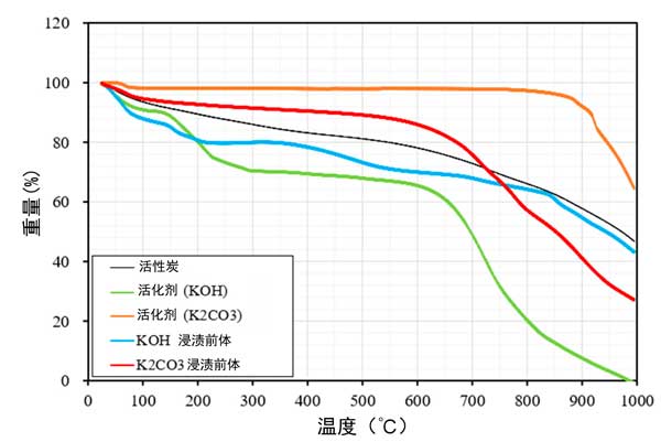 ¡¡¡¡Í¼1ÏÔʾÁËÓÃ×÷̼ǰÌåµÄľÖÊ»îÐÔÌ¿¡¢»¯Ñ§»î»¯¼Á(ÇâÑõ»¯¼ØºÍ̼Ëá¼Ø)ÒÔ¼°½þ×ÕÓл¯Ñ§ÊÔ¼ÁµÄ»îÐÔÌ¿µÄTGA½á¹û¡£Ê¹ÓÃÇâÑõ»¯¼ØºÍ̼Ëá¼Ø»î»¯µÄÑùÆ·µÄÖØÁ¿Ëðʧ·´Ó³Á˻¼ÁµÄ²»Í¬ÈÈÐÔÄÜ¡£ÓÉÓÚ̼Ëá¼ØÏà¶ÔÓÚÇâÑõ»¯¼ØµÄÈÈÎȶ¨ÐԸߣ¬Òò´ËÔÚ850¡æÊ±²»»áÆðµ½»î»¯¼ÁµÄ×÷Óá£È»¶ø£¬ÓÃ̼Ëá¼Ø½þ×յĻîÐÔÌ¿µÄÖØÁ¿ËðʧÆðʼµã£¬¼´·Ö½âζȣ¬±È̼Ëá¼ØµÄµÍÔ¼200¡æ¡£ÊÂʵÉÏ£¬ÓÃÊÔ¼Á½þ×յĻîÐÔÌ¿ÑùÆ·µÄTGAÇúÏßÈ¡¾öÓÚ»ìºÏÎïÖеÄ̼ÓëÊÔ¼ÁµÄ±ÈÀý¡£Òò´Ë£¬´ËÀà»ìºÏÎïµÄTGAÇúÏßͨ³£ÓëÁ½ÖÖ²ÄÁϵÄÈÈÐÔÄÜÒ»Æð»æÖÆ¡£È»¶ø£¬ÔÚ¸ßÓÚ750¡æµÄζÈÏ£¬ÓÃ̼Ëá¼Ø½þ×յĻîÐÔÌ¿±Èº¬ÓÐδ¾´¦ÀíµÄ»îÐÔÌ¿µÄÑùÆ·±íÏÖ³ö¸ü´óµÄÖØÁ¿Ëðʧ¡£¼øÓÚ̼Ëá¼ØÓÉÓÚÆäÈÈÎȶ¨ÐÔ¶øÔÚ891¡æÖ®Ç°±íÏÖ³öµÄÖØÁ¿Ëðʧ¿ÉÒÔºöÂÔ²»¼Æ£¬Óëδ´¦ÀíµÄ»îÐÔÌ¿Ïà±È£¬Ì¼Ëá¼Ø½þ×ÕµÄÖØÁ¿Ëðʧ¸ü´ó±íÃ÷ÈÈÐÔÄÜÓÉÓÚ½þ×Õ¶ø¸Ä±ä¡£ÕâЩ½á¹û±íÃ÷ÈܽâÔÚÇâÑõ»¯¼Ø»¯Ñ§»î»¯·ÏË®ÖеÄ̼Ëá¼Ø¿ÉÒÔͨ¹ý½þ×Õ¹ý³ÌÖØÐÂʹÓá£