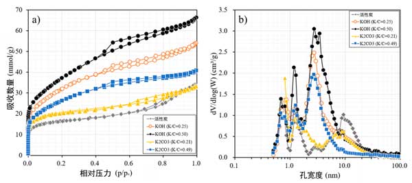 ¡¡¡¡Í¼2£º(a)µªµÈÎÂÏߺÍ(b)ͨ¹ýÓÃÇâÑõ»¯¼ØºÍ̼Ëá¼ØÒÔ²»Í¬¼Ø/Ì¿±È½þ×ÕÖÆ±¸µÄ»îÐÔÌ¿µÄ¿×¾¶·Ö²¼¡£