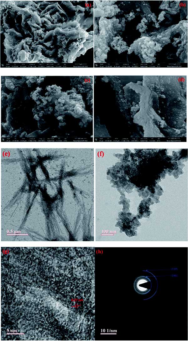¡¡¡¡Í¼2£º(a-d)FESEMͼÏñ£¬(e,f)TEMͼÏñ£¬(g)HRTEMͼÏñºÍ(h)ÔØîâ»îÐÔÌ¿µÄSAEDͼ°¸¡£
