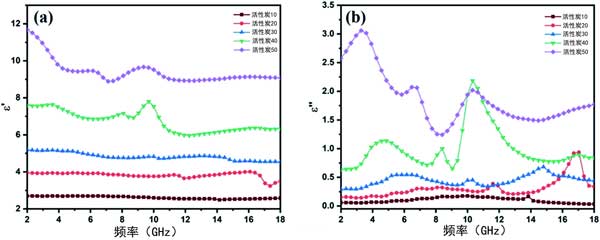 ¡¡¡¡ÓëεÀàËÆ£¬Í¼3bÖÐÃè»æµÄεÖµÒ²ÏÔʾ³öËæ×ÅÌîÁÏ(ÔØîâ»îÐÔÌ¿)¸ºÔØÔö¼Ó¶øÔö¼ÓµÄÇ÷ÊÆ¡£Õâ¿ÉÒÔ¹éÒòÓÚ»îÐÔÌ¿º¬Á¿µÄÔö¼Ó£¬ÕâÔö¼ÓÁËÑùÆ·µÄµçµ¼ÂÊ¡£Ôö¼Ó̼º¬Á¿»á½µµÍÎüÊÕ¼ÁµÄµç×èÂÊ£¬´Ó¶øÔö¼ÓεÖµ¡£µ±ÔØîâ»îÐÔÌ¿¸ºÔØÔö¼Óµ½10wt%ÒÔÉÏʱ£¬ÔÚ¸´½éµç³£ÊýÖлñµÃÁ˼¸¸ö³ÚÔ¥·å¡£ÓÉÓÚ»îÐÔÌ¿µÄ¼ÓÈëµ¼Öµ絼ÂʵÄÔö¼Óµ¼Ö¶îÍâµç×ÓµÄÇ¨ÒÆ£¬È»ºóÕâЩµç×Óͨ¹ýÓë¾§¸ñÅöײÀ´×ª»»µç´ÅÄÜÁ¿£¬µ¼Ö¸ߴ«µ¼ËðºÄ¡£Ëü»¹¸Ä½øÁË×迹ƥÅä²¢¼õÉÙÁË΢²¨µÄ±íÃæ·´É䣬´Ó¶øÔÊÐí¸ü¶àµÄ΢²¨½øÈëÎüÊÕÆ÷¡£Æä´Î£¬Ê¯À¯ÖлîÐÔÌ¿ºÍ¶þÁò»¯îâµÄ½áºÏµ¼ÖÂÁ˶à¸ö½çÃæ£¬´Ó¶øÔö¼ÓÁ˽çÃæ¼«»¯¡£µÚÈý£¬ÓÉÓÚ»îÐÔÌ¿ÖдæÔڵĿ׺ÍȱÏݵ¼ÖµIJ»¶Ô³ÆµçºÉ·Ö²¼µ¼ÖÂż¼«×ÓµÄÐγɡ£ÔÚ½»±äµç´Å³¡Ï£¬ÕâЩż¼«×ÓÐýתÒÔÓëµç´Å³¡¶ÔÆë£¬´Ó¶ø½«µç´ÅÄÜת»¯ÎªÈÈÁ¿¡£Òò´Ë£¬¿ÉÒԵóö½áÂÛ£¬»îÐÔÌ¿ÔØ¶þÁò»¯îâ¾ßÓÐÓÃÓÚ΢²¨ÎüÊÕÓ¦ÓõÄDZÁ¦¡£
