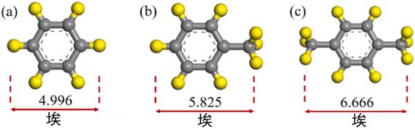¡¡¡¡Í¼2£º²»Í¬·¼Ìþ·Ö×ÓµÄÄ£ÐÍ(a)±½;(b)¼×±½;(c)¶Ô¶þ¼×±½¡£