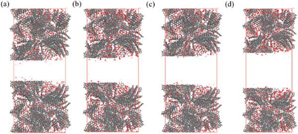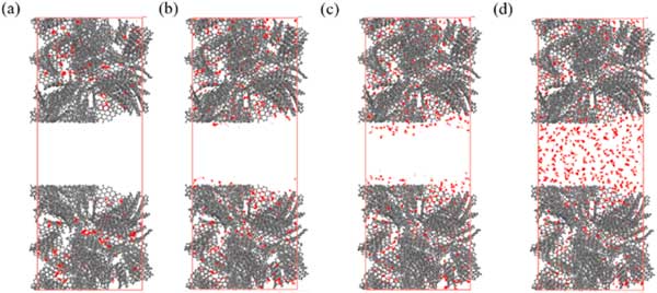 ¡¡¡¡»îÐÔÌ¿ÓÉ΢¿×ºÍ½é¿××é³É£¬½é¿×ÔÚÒ»¶¨³Ì¶ÈÉÏÓ°ÏìÎü¸½ÌØÐÔ¡£Òò´Ë£¬Ñо¿·¼ÌþÔÚ¾ßÓзּ¶¿×µÄ»îÐÔÌ¿ÉϵÄÎü¸½ÌØÐÔ£¬ÒÔÃ÷È·½é¿×¶ÔÏÂÒ»½ÚÎü¸½ÌØÐÔµÄÓ°Ïì¡£ÔÚÕâЩģÄâÖУ¬Ñ¡ÔñÁËÃܶÈΪ0.8g/cm3µÄ΢¿×»îÐÔÌ¿£¬²»Í¬ÑùÆ·µÄÖп׳ߴç·Ö±ðÑ¡ÔñΪ2.0¡¢2.5¡¢3.0ºÍ4.0nm¡£¾ßÓв»Í¬²ã´Î¿×϶µÄ»îÐÔÌ¿¡£·Ö²ã¿×϶»îÐÔ̿ģÐ͹¹½¨ÎªÃܶÈÔÚ0.6-0.7g/cm3µÄºÏÀí·¶Î§ÄÚ¡£Í¼3չʾÁ˱½·Ö×ÓÔÚp=10kPaϾßÓв»Í¬Öг߶ȿ׾¶µÄ»îÐÔÌ¿ÉϵÄÎü¸½Î»µã·Ö²¼¡£Õâ±íÃ÷¼´Ê¹ÔÚp=10kPaʱ£¬±½µÄÎü¸½Ò²½ö·¢ÉúÔÚ½é¿×±íÃæ£¬¶ø²»»áÌî³ä½é¿×µÄ¿Õ϶¿Õ¼ä¡£Í¼4˵Ã÷Á˶Զþ¼×±½ÔÚ¾ßÓÐ3.0nm¿×µÄ»îÐÔÌ¿ÉÏ´ÓµÍѹµ½¸ßѹµÄÎü¸½Î»µãµÄ±ä»¯¡£´Óͼ4(a)-(d)¿ÉÒÔ¿´³ö£¬Ö»ÓÐ΢Á¿µÄ¶Ô¶þ¼×±½·Ö×Ó±»Îü¸½µ½Î¢¿×ÉÏ£¬µ±Ñ¹Á¦Îª1.25kPaʱ£¬Î¢¿×Öð½¥±»ÌîÂú£¬ÖпױÚÉϳöÏÖÎü¸½Î»µã¡£µ±Ñ¹Á¦Ôö¼Óµ½3.75kPaʱ£¬Îü¸½Î»µãÔö¼Ó£¬½é¿×ÖпªÊ¼³öÏÖ¶à²ãÎü¸½£¬×îÖÕ½é¿×³äÂú¶Ô¶þ¼×±½£¬´ËʱѹÁ¦¿É´ï6.25kPa¡£