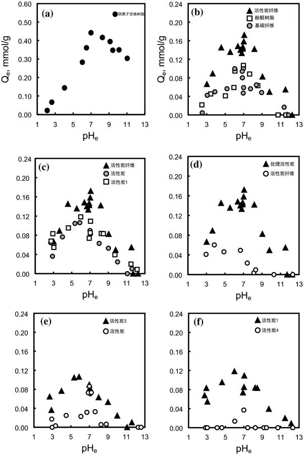 ¡¡¡¡Í¼1£º»îÐÔÌ¿ÔÚ¸÷ÖÖÆ½ºâpH·¶Î§ÄÚ¶ÔÉéÎü¸½µÄÓ°Ïì¡£