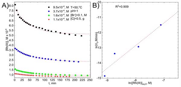 ¡¡¡¡ºÜÃ÷ÏÔ£¬îîä廯ÎïÂçÀë×ӵijõʼŨ¶È½«Ó°ÏìËüÃÇÔÚµç½âÖÊÖÐµÄÆ½ºâŨ¶ÈºÍÎü¸½¹ý³ÌµÄËÙÂÊ¡£ÕâÊÇͼ2A£¬ÆäÖлæÖÆÁËÔÚT=50¡æÏÂÔÚ½Á°èÈÜÒºÖлñµÃµÄ¶¯Á¦Ñ§ÇúÏߣ¬½Á°èËÙÂÊΪ1200rpm¡£µÃµ½Àë×ÓÖ®¼äµÄÏßÐÔÏà¹ØÐÔ£¬È·¶¨ÏµÊý½Ó½üͼ2B¡£ÄâºÏÏßµÄбÂʵÈÓÚ1.48±0.33£¬Ö¤ÊµÁ˳õʼ¼ÙÉ裬¼´¹ØÓÚîîä廯ÎïÂçÀë×Ó³õʼŨ¶ÈµÄ·´Ó¦µÄµÚÒ»¼¶¡£Îü¸½¶¯Á¦Ñ§»¹Ó¦È¡¾öÓÚ»îÐÔÌ¿µÄ±íÃæ»ý£¬Ç°ÌáÊÇϵͳ²»ÊÜÀ©É¢¿ØÖÆ¡£ÕâÒÑÕë¶Ô²»Í¬Å¨¶ÈµÄÎü¸½¼Á½øÐÐÁËÑéÖ¤¡£