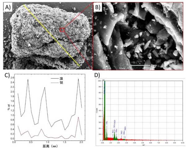 ¡¡¡¡Í¼3£ºÎü¸½ÊÔÑéºó»îÐÔÌ¿ÑùÆ·µÄSEMͼÏñ(A)±íʾ½øÐÐEDS·ÖÎöµÄÏßµÄ×ÜÌåÊÓͼ£¬(B)½øÐÐEDSµã·ÖÎöµÄÇøÓòµÄ·Å´óÂÊ£¬(C)EDSÏß·ÖÎö½á¹û£¬(D)Ñ¡¶¨µãµÄEDS¹âÆ×¡£