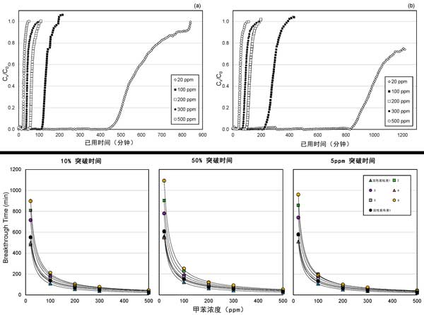 ¡¡¡¡Í¼2£º(a)»îÐÔÌ¿ÂËо1ºÍ(b)6СÖùÀàÐ͵ÄÍ»ÆÆÇúÏß(°´¼×±½Å¨¶È),´©Í¸Ê±¼äÓ벻ͬСÖùÀàÐ͵ļױ½Å¨¶ÈµÄº¯Êý¹ØÏµ¡£