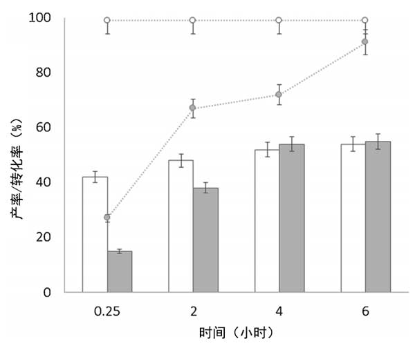 ¡¡¡¡Í¼1£º»îÐÔÌ¿ÔØÑõ»¯Îý(°×É«ÌõºÍµã)ºÍÑõ»¯Ð¿(»ÒÉ«ÌõºÍµã)´ß»¯¼ÁϹûÌǵ½ÈéËáÒÒõ¥µÄ²úÂÊ(Ìõ)ºÍת»¯ÂÊ(µã)¡£