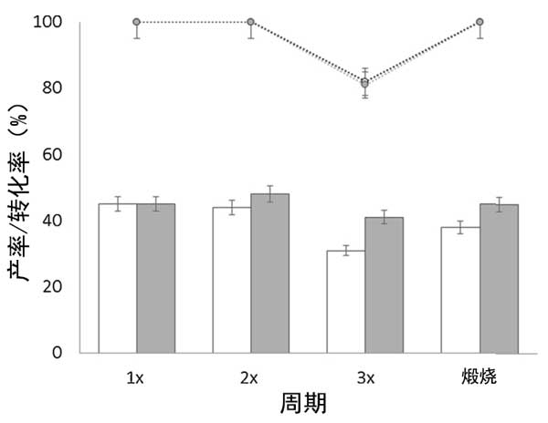 ¡¡¡¡Í¼2£ºÔÚ160¡æµÄ20mLÒÒ´¼ÖÐ´ÓÆÏÌÑÌÇ(0.1g)´ß»¯¼ÁÑõ»¯Îý»îÐÔÌ¿(°×É«)ºÍÑõ»¯Ð¿»îÐÔÌ¿(»ÒÉ«)µÄ»ØÊÕʵÑéÖÐÈéËáÒÒõ¥µÄת»¯ÂÊ(µã)ºÍ²úÂÊ(Ìõ)¡£
