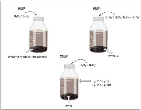 ¡¡¡¡ÔÚ¶Ô50¼ÒÒûÓÃË®¹«ÓÃÉèÊ©½øÐеĵ÷²éÖУ¬»ñµÃ¹ýÑõ»¯ÇâºÍä廯ÎïµÄƽ¾ùÖµÀ´µ±×ö²âÊÔÓÃË®¡£ÔÚËùÓÐʵÑéÖУ¬ÅúÁ¿·´Ó¦Æ÷¶¼Óñ¡²°ü¹ü¡£ÖƱ¸0.052µmol/LäåËáÄÆÈÜÒº²¢¼ÓÈë¼äЪ·´Ó¦Æ÷ÖÐÒÔ»ñµÃ0.5µmol/LäåËáÑεÄŨ¶È¡£¸ß¼¶Ñõ»¯¹¤ÒÕÖеijöË®²ÐÁô¹ýÑõ»¯ÇâŨ¶È²»»á³¬¹ý180µmol/L¡£Òò´Ë£¬ÔÚ±¾Ñо¿ÖУ¬½«150µmol/¹ýÑõ»¯Çâ¼ÓÈëµ½¼äЪʽ·´Ó¦Æ÷ÖС£Èçͼ1Ëùʾ£¬ÔÚ23–27¡æµÄ»·¾³Î¶ÈÏ£¬Ê¹ÓÃ36¸öÅú´Î²£Á§Æ¿½øÐÐÁËһϵÁÐʵÑé¡£»îÐÔÌ¿ÓÃÁ¿Ê¼ÖÕΪ5g/L£¬¹ýÑõ»¯ÇâºÍäåËáÑÎŨ¶ÈʼÖÕ·Ö±ðΪ150µmol/LºÍ0.5µmol/L¡£ËùÓÐ×°ÓйýÑõ»¯ÇâµÄ¼äЪʽ·´Ó¦Æ÷¶¼ÓÃÂÁ²¸²¸Ç£¬ÒÔ·ÀÖ¹¹ýÑõ»¯Çâ±»¹âDZÔÚ½µ½â¡£ÔÚÈçͼ1ËùʾµÄʵÑéÖУ¬Ê¹ÓÃ16¸ö¼äЪʽ·´Ó¦Æ÷ºÍÈýÖÖ²»Í¬µÄ»îÐÔÌ¿(»îÐÔÌ¿¡¢ÔÙÉú»îÐÔÌ¿ºÍÔ¤¼ÓÔØ»îÐÔÌ¿)À´Ñо¿²»Í¬ÔËÐÐʱ¼äµÄ»îÐÔÌ¿¶ÔäåËáÑκ͹ýÑõ»¯ÇâµÄÈ¥³ý£¬¸ÃʵÑéÉæ¼°°Ë¸ö´¦Àí×é¡£
