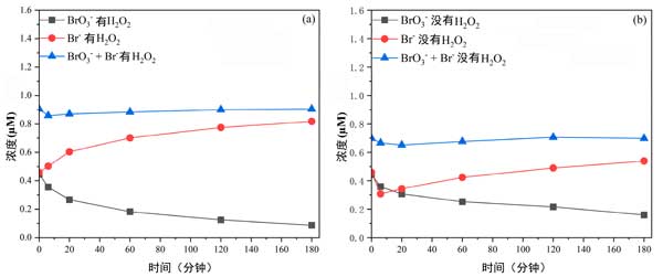 ¡¡¡¡Í¼3£º¸÷ÖÖäåËáÑÎÓë²»´æÔںʹæÔÚ¹ýÑõ»¯ÇâµÄÇé¿öϵÄŨ¶È(a)ÓйýÑõ»¯Ç⣬(b)ûÓйýÑõ»¯Çâ¡£
