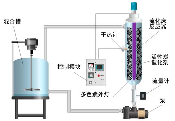 ¡¡¡¡Í¼1£ºÖÐÊÔ¹æÄ£µÄÁ÷»¯´²¹â·´Ó¦Æ÷ʾÒâͼ£¬ÓÃÓÚ´Ó¹¤Òµ·ÏË®ÖÐÈ¥³ý±½°·ºÍ±½²¢àçßòµÄ¹â´ß»¯ºÍÎü¸½ÊµÑé¡£