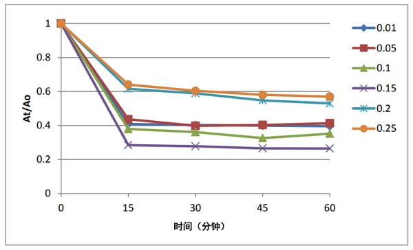 ¡¡¡¡ÎªÁËÑо¿ËùÓûîÐÔÌ¿ÓÃÁ¿¶ÔÆäÄ£ÄâË®ÈÜÒºÖÐȾÁÏÈ¥³ýЧÂʵÄÓ°Ï죬ʹÓò»Í¬ÓÃÁ¿µÄ»îÐÔÌ¿¸´ºÏ²ÄÁϽøÐÐÁËһϵÁÐʵÑé¡£ÕâЩÖÊÁ¿·Ö±ðΪ0.01¡¢0.05ºÍ0.10¡¢0.15¡¢0.20ºÍ0.25g¡£ÕâЩʵÑéÊÇÔÚÏàͬÌõ¼þϽøÐеģ¬ËùÓÐÔËÐеÄÎü¸½Ê±¼äΪ1Сʱ¡£Í¨¹ýÔÚ468nm´¦²âÁ¿Îü¹â¶ÈÀ´¼Ç¼ÉÏÇåÒºµÄÎü¹â¶ÈÀ´¸ú×ÙÎü¸½ÄÜÁ¦¡£´Ó»ñµÃµÄ½á¹û£¬·¢ÏÖÓÃÁ¿Îª0.15g¡£Èçͼ3Ëùʾ£¬ËùÓûîÐÔÌ¿¸´ºÏ²ÄÁϵÄȾÁÏÈ¥³ýЧ¹ûºÃ£¬Èçͼ3Ëùʾ¡£Ôö¼Ó´ß»¯¼ÁÓÃÁ¿¡£Õâ¿ÉÄÜÓëËæ×ÅËùÓòÄÁϵÄÖÊÁ¿Ôö¼Ó¶øÔö¼Ó¿ÉÓÃÎü¸½Î»µãÓйء£Õ⽫µ¼ÖÂÔÚ¿ÉÓõÄÎü¸½Î»µãÉÏÎü¸½¸ü¶àµÄȾÁÏ·Ö×Ó¡£ÔÚʹÓôóÓÚ0.15¿ËµÄÓÃÁ¿Ê±£¬È¾ÁÏÈ¥³ýЧÂʻήµÍ£¬Õâ¿ÉÒÔ½âÊÍΪÔÚʹÓø߼ÁÁ¿Îü¸½¼Áʱ»áÔö¼ÓÈÜÒºµÄÃܶȺͲÄÁÏ¿ÅÁ£µÄ¾Û¼¯¡£