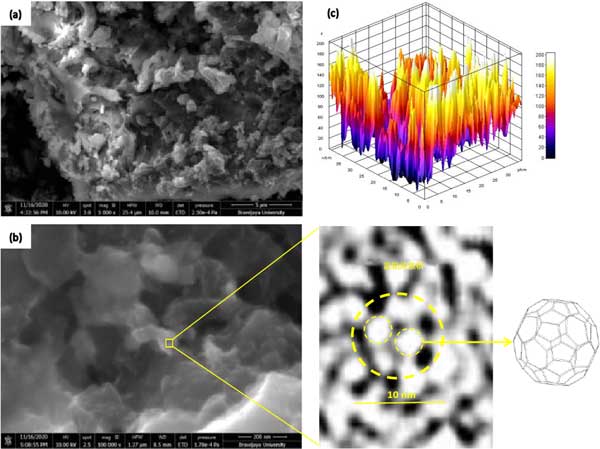 ¡¡¡¡Í¼1£º(a)·Å´ó5000±¶µÄ»îÐÔÌ¿±íÃæÐÎ̬(b)»îÐÔÌ¿Äڵĸ»ÀÕÏ©´Ø(c)±íÃæµçºÉ¡£
