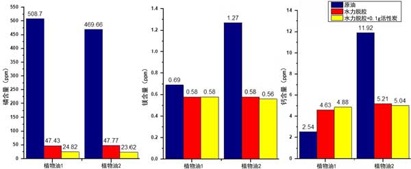 ¡¡¡¡Á׺¬Á¿ÔÚÁ½¸öÁ½ÖÖÖ²ÎïÓÍÖÐÖ÷ÒªÓÉÒÔËùʾµÄ´¦Àí(Ë®ÖØÁ¿2%+»îÐÔÌ¿0.1¿Ë)ºó¼õÉÙͼ2¡£Ö²ÎïÓÍ1µÄÁ׺¬Á¿½µµÍÁË´óÔ¼95.22%£¬¶øÖ²ÎïÓÍ2µÄÁ׺¬Á¿½µµÍÁË´óÔ¼ÏàͬµÄÖµ(94.98%)¡£ÓÍÒº¾Ë®ÍѽººóMg¡¢Caº¬Á¿ÂÔÓÐϽµ£¬¶øCa´¦ÀíºóÂÔÓÐÉý¸ß¡£ÕâÒ»½á¹û¿ÉÄÜÊÇÓÉÓÚÔÚ´¦Àí¹ý³ÌÖлîÐÔÌ¿ÖдæÔÚһЩCa½âÀë»ØÓÍÏà¡£»îÐÔÌ¿¶ÔÁ׺¬Á¿µÄ´óÁ¿½µµÍÊÇÓÉÓÚNaOH¸ÄÐԵĻîÐÔÌ¿¾ßÓм«ÐÔ¡¢´øÕýµçºÉµÄ±íÃæ¡£ÓÉÓÚ´æÔÚ·¼»·´ØºÍ¹ÌÓÐȱÏÝ£¬Ëü»¹¾ßÓдÅÁ¦¡£ÔÚÍѽº¹ý³ÌÖн«»îÐÔÌ¿Ìí¼Óµ½Ö²ÎïÓͺÍË®ÖÐʱ£¬»îÐÔÌ¿µÄ·¼»·´ØÖеÄÀëÓòµç×Ó²úÉú´Å¾Ø£¬Ç¿ÁÒÓÕµ¼Á×Ö¬Á×ËáÍ·²¿ÖÜΧµÄ˳´ÅÐÔÑõ¡£Í¬Ê±£¬»îÐÔÌ¿µÄ¼«ÐÔ/Ç×Ë®ÐÔÒ²ÔÊÐíÓ뼫ÐÔË®·Ö×ÓÏ໥×÷Óá£Ë®·Ö×ÓÒ²±»´Å³¡¼¤»î£¬´Ó¶ø·¢ÉúÇâ×ÔÐý´ÓÅÔË®µ½ÁÚË®µÄÖØÐ¶¨Ïò£¬´Ó¶ø½µµÍË®µÄ¿¹´ÅÐÔ¡£»îÐÔÌ¿ÓÕµ¼µÄÕâÖִų¡»áµ¼Ö±íÃæÕÅÁ¦½µµÍ£¬Ï÷ÈõË®·Ö×ӵķÖ×ÓÄÚÄÜ¡£½á¹û£¬¸ü¶àµÄË®·Ö×Ó±»·Ö½â³ÉH+Àë×ÓºÍOH-Àë×Ó£¬´Ù½ø¸ü¶àË®½â·´Ó¦¡£ÕâЩÏÖÏóÓëÆäËûÁ¦Á¿Ïà½áºÏ£ºÈÈÄܺÍÀëÐÄÒ²»áÒý·¢Á×Ö¬·Ö×ÓÄڵļü¶ÏÁÑ£¬µ¼ÖÂÁ×ËáÍ·²¿»ùÍÅ´ÓÁ×Ö¬·Ö×ÓÉÏ·ÖÀë(ÍÑÁ×Ö¬)¡£
