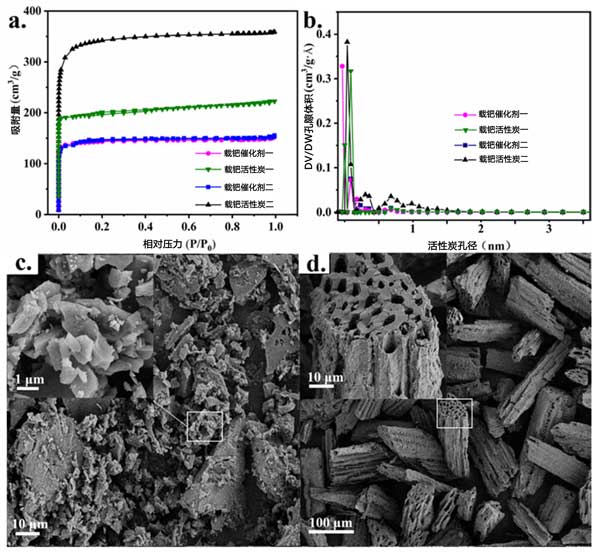 ¡¡¡¡Í¼2£º(a)N2ÎüÊÕ-½âÎüµÈÎÂÏߺÍ(b)¸÷ÖÖ´ß»¯¼ÁµÄ¿×¾¶·Ö²¼¡£(c)»îÐÔÌ¿´ß»¯¼ÁÒ»ºÍ(d)´ß»¯¼Á¶þµÄSEMͼÏñ¡£