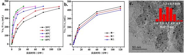 ¡¡¡¡Í¼3£º(a)ÔÚ²»Í¬·´Ó¦Î¶ÈÏÂÓÉ»îÐÔÌ¿ÔØîÙ´ß»¯µÄ×ÜÌå»ý(H2+CO2)Éú³ÉºÍ(b)¼×Ëá·Ö½âµÄÎȶ¨ÐÔ²âÊÔ¡£(c)»ØÊյĻîÐÔÌ¿´ß»¯¼ÁTEMÏÔ΢ÕÕÆ¬ºÍÁ£¶È·Ö²¼¡£