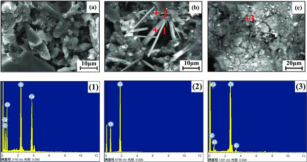 ¡¡¡¡Í¼2£º»îÐÔÌ¿ºÍΣ·Ï»îÐÔÌ¿µÄSEMͼÏñºÍEDS½á¹û¡£(a)Σ·Ï»îÐÔ̿ͼÏñ;(b,c)»îÐÔ̿ͼÏñ(1)CaSO4;(2)µÄSiO2;(3)KCl¡£