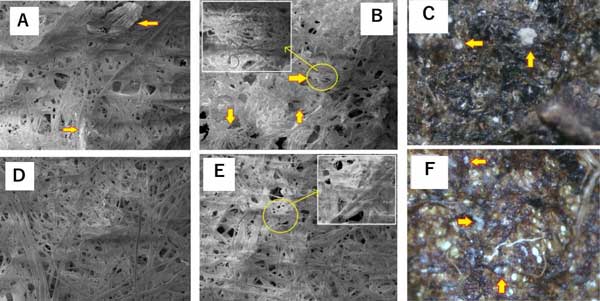 ¡¡¡¡Í¼3£ºÖ½±íÃæµÄÏÔ΢Íâ¹Û(50±¶·Å´ó)£¬(A)ÔÚÉúÎï½µ½â²âÊÔǰ´øÓÐÄÉÃ×»îÐÔÌ¿/ÏËÎ¬ËØÖ½;(BC)¾ÉúÎï½µ½âÊÔÑéºóµÄÄÉÃ×»îÐÔÌ¿/ÏËÎ¬ËØÖ½;(D)ÏËÎ¬ËØÖ½½öÔÚÉúÎï½µ½âÊÔÑé֮ǰ;(EF)ÏËÎ¬ËØÖ½½ö¾¹ýÉúÎï½µ½â²âÊÔ¡£»ÆÉ«ÏÁÕ¶ÔÓ¦ÓÚÀ´×ÔÍÁÈÀµÄÕæ¾ú¾úË¿Ì壬²åÈëµÄͼÏñ·Å´ó250±¶¡£
