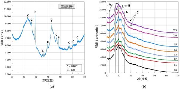 ¡¡¡¡Í¼2£º(a)ÔÁÏ·Û×´»îÐÔÌ¿µÄXRDͼ£¬(b)º¬0%(C0)¡¢1%(C1)¡¢2%(C2)¡¢3%(C3)¡¢4%(C4)¡¢5%(C5)¡¢10%(C10)ºÍ15%(C15)»îÐÔÌ¿µÄÈÈËÜÐÔµí·ÛÑùÆ·µÄXRDͼ¡£