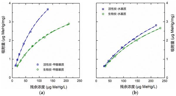 ¡¡¡¡ÎªÁËÔÚ»îÐÔÌ¿ºÍÉúÎïÌ¿²ÄÁÏµÄÆÀ¹À¹ý³ÌÖÐÓ¦Ó÷dz£ÏÖʵµÄÌõ¼þ£¬¹ØÓÚ¼×»ù¹¯µÄÈ¥³ý£¬ÔÚpHֵΪ7ʱӦÓÃÀàËÆÌìÈ»µÄË®ÒÔ»ñµÃÎü¸½µÈÎÂÏß¡£´ËÍ⣬³õʼ¼×»ù¹¯Å¨¶ÈΪ500μg Hg/L£¬ÊÔͼÂú×ãÁ½¸ö·½Ã棬¼´½Ó½üRLµÄ²ÐÓàŨ¶ÈºÍÓ¦ÓõÈÎÂÄ£Ð͵ÄÓÐЧÄâºÏ¡£¹ØÓÚµÈÎÂÄ£ÐÍ£¬ÎªÆÕ±éÎü¸½·½³Ì£¬¿¼ÂÇÒºÏàÎü¸½¡£µÈÎÂÊý¾ÝºÍÏàÓ¦·½³ÌµÄÄâºÏÈçͼ1Ëùʾ¡£ËùÓиÄÐÔ²ÄÁ϶¼ÏÔʾ³öÁ½ÖÖÄ£Ð͵ĸ߶ÈÏà¹ØÐÔ£¬Õâ¹éÒòÓÚÏ൱µÍµÄÎü¸½¸ººÉ£¬Òò´Ë£¬ËüÃÇ´ú±íÁ˵¥²ã¸²¸Ç¡£ÁíÒ»·½Ã棬µ±Ó¦Óóõʼδ¸ÄÐÔ²ÄÁÏʱ£¬ÔÚÏàͬµÄʵÑéÌõ¼þÏ£¬µÈÎÂÄ£Ðͺ͸߲ÐÁô¼×»ù¹¯Å¨¶È¾ù³ÊÏÖÁãÏà¹ØÐÔ¡£