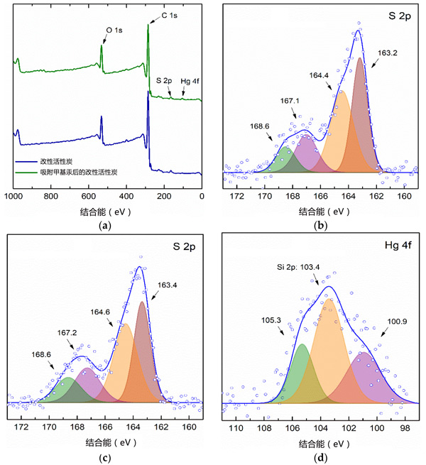 ¡¡¡¡¸ù¾ÝµÈÎÂÊý¾Ý£¬·¢ÏÖÁò´¼¸ÄÐÔ»îÐÔÌ¿²ÄÁÏÔÚÈ¥³ýMeHg·½ÃæÊÇ×îºÃµÄ£¬²¢ÓÃÓÚ½øÒ»²½Ñо¿Îü¸½»úÖÆ¡£»îÐÔÌ¿Îü¸½¼ÁÔÚMeHgÎü¸½Ç°ºóµÄXPS¹âÆ×(ͼ3a)Óë¸÷×ԵĻ¯Ñ§/ÔªËØ·ÖÎöÒ»Ö£¬±íÃ÷Æä×é³ÉµÄÖ÷ÒªÔªËØÊÇ̼¡¢ÑõºÍÁò¡£´ËÍ⣬±¥ºÍÑùÆ·(ʹÓúó)Öй¯4f·åµÄ´æÔÚ±íÃ÷MeHgÎü¸½¡£»îÐÔÌ¿ÔÚ¼×»ù¹¯Îü¸½Ö®Ç°ºÍÖ®ºóµÄS2pºËÐļ¶¹âÆ×µÄ¸ß·Ö±æÂÊ·Ö±ðÈçͼ3b¡¢cËùʾ¡£ÔÚÕâÁ½ÖÖÇé¿öÏ£¬S2p¹âÆ×¶¼ÏÔʾ³öÁ½¶Ô·å£¬ËüÃǶÔÓ¦ÓÚ²»Í¬µÄÁò¼ü/ģʽ¡£ÔÚͼ3dÖУ¬ÏÔʾÁ˹ØÓÚ±¥ºÍ¸ÄÐÔ»îÐÔÌ¿µÄ¹¯4fºËÐļ¶¹âÆ×µÄ¸ß·Ö±æÂÊ¡£