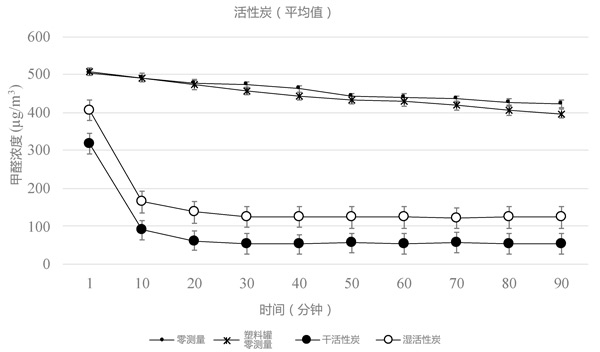 对植物净化空气中污染物的研究很早就开始了,迄今为止,已经研究并确定了几种植物物种可用于去除甲醛。然而,之前的研究已经测试了极高浓度的甲醛,高于通常在常见室内环境中发现的浓度。本研究展示了浓度为正常室内的甲醛吸收结果,该浓度在室内甲醛检测阈值范围内并接近基于感官效果的准则值。此外,甲醛可溶于水。因此,它可能在潮湿环境中消耗得更快。不过单独使用活性炭的甲醛去除率是比较高的作为对照,并且研究的四种植物物种表现出相似的去除甲醛的能力。在这组实验中,当存在湿基质时,室内甲醛浓度的降低速度更快,并且植物物种在去除甲醛方面具有相似的行为。然而,单纯的活性炭去除甲醛的效果不稳定。在任何情况下,活性炭都没有最佳性能。图2显示了干活性炭和湿活性炭对室内甲醛消耗的影响结果。第三个湿活性炭样品被排除在外,因为湿活性炭没有降低甲醛浓度,而是将其释放到室内,这是因为水把活性炭的孔隙填满了,导致活性炭吸附不了甲醛了,而且溶解在水中的甲醛在活性炭中留存,所以导致后来的释放甲醛。