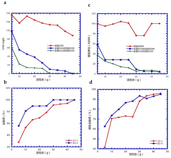 ¡¡¡¡²»Í¬»îÐÔÌ¿ÓÃÁ¿ÔÚ24ºÍ54СʱºóCODºÍADMIµÄ±ä»¯Èçͼ2Ëùʾ¡£ÔÚ³õʼCODŨ¶ÈΪ88-136mg/LµÄÇé¿öÏ£¬·Ö±ðͨ¹ýÎü¸½È¾ÁÏ·ÏË®24ºÍ52СʱÀ´Íêȫȥ³ýCODÐèÒª45ºÍ30gµÄ»îÐÔÌ¿ÓÃÁ¿(ͼ2ab)¡£ADMIµÄ½µµÍºÍÈ¥³ýÇ÷ÊÆËæ»îÐÔÌ¿ÓÃÁ¿24ºÍ52СʱµÄ±ä»¯ÓëCOD±ä»¯ÏàËÆ(ͼ2)¡£ADMIËæ×Å»îÐÔÌ¿ÓÃÁ¿µÄÔö¼Ó¶ø½µµÍ¡£»îÐÔÌ¿Îü¸½24СʱºÍ52Сʱºó£¬²ÐÁôADMI·Ö±ðΪ4-5ºÍ5-7¡£Ëæ×Å»îÐÔÌ¿ÓÃÁ¿≥30g£¬ADMIµÄÈ¥³ýЧÂÊ´Ó88-96%Ìá¸ßµ½90-95%¡£