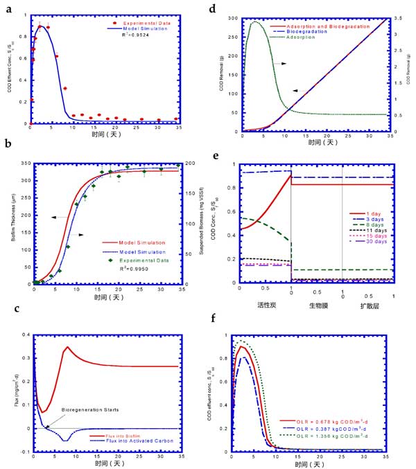 ¡¡¡¡Í¼3£ºÊµÑé½á¹ûºÍÄ£ÐÍÄ£Äâ(a)CODÁ÷³öÎ(b)ÉúÎïÖÊÉú³¤£¬(c)Á÷ÈëÉúÎïĤºÍ»îÐÔÌ¿µÄͨÁ¿£¬(d)CODÈ¥³ý£¬(e)CODÇúÏߣ¬ºÍ(f)CODÁ÷³öÎï¸÷ÖÖÓлú¸ºÔØÂÊ(OLR)¡£