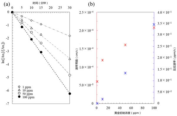 图1:(a)初始金浓度对金离子回收率的影响,和(b)通过铝和活性炭在铵中的电流相互作用进行的胶合反应的速率常数/反应速率与初始金浓度的关系图硫代硫酸盐体系(注意反应速率为负值)。