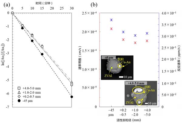 图2:(a)活性炭尺寸对金离子回收率的影响,以及(b)铝和活性炭在硫代硫酸铵体系中通过电偶相互作用进行的胶合反应的速率常数/速率与活性炭尺寸的关系图(注意,反应速率为负值)。