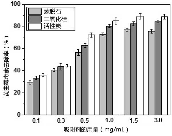 ¡¡¡¡ÈýÖÖÎü¸½¼Á¶ÔAFB1µÄÎü¸½ÔÚ25¡æÏ½øÐÐ24Сʱ¡£Í¼1ÏÔʾÁË»îÐÔÌ¿ºÍÆäËüÎü¸½¼ÁÓÃÁ¿µÄAFB1È¥³ýÂÊ¡£ÎÞÂÛÎü¸½¼Á¼ÁÁ¿ÈçºÎ£¬Ê¹ÓûîÐÔ̿ʱȥ³ýÂʸü¸ß£¬Æä´ÎÊǶþÑõ»¯¹èºÍÌìÈ»ÃÉÍÑʯ¡£ÕýÈçÔ¤ÆÚµÄÄÇÑù£¬AFB1µÄÈ¥³ýÂÊËæ×ÅÎü¸½¼Á¼ÁÁ¿µÄÔö¼Ó¶øÔö¼Ó£¬Õâ¿ÉÒÔͨ¹ýAFB1ÓëÎü¸½¼ÁÖ®¼äµÄÏ໥×÷ÓÃÔö¼ÓÀ´½âÊÍ£¬°üÀ¨Çâ¼ü¡¢¿×Ìî³äºÍ¾²µçÎüÒýÁ¦¡£Îü¸½¼ÁÁ¿Îª1.0mg/mLʱ£¬»ÆÇúù¶¾ËصÄÈ¥³ýÂÊʹÓÃÃÉÍÑʯ¡¢¶þÑõ»¯¹èºÍ»îÐÔ̿ʱ£¬·Ö±ðΪ73.23%¡¢80.35%ºÍ85.09%¡£ÔڽϸߵÄÎü¸½¼ÁÁ¿(1.5mg/mL)Ï£¬È¥³ýÂÊ·Ö±ðÂÔ΢Ôö¼ÓÖÁ75.56%¡¢83.48%ºÍ89.15%¡£ÔÚÕâ¸öÎü¸½ÏµÍ³ÖУ¬µ±Îü¸½¼ÁÒԽϵÍŨ¶ÈʹÓÃʱ£¬¿ÉÓõÄÎü¸½Î»µã½ÏÉÙ¡£Òò´Ë£¬Ôö¼ÓÎü¸½¼ÁŨ¶ÈÓÐЧµØÔö¼ÓÁËÎü¸½Î»µãµÄÊýÁ¿£¬´Ó¶øÌá¸ßÁËAFB1µÄÈ¥³ýÂÊ¡£µ«Å¨¶È¹ý¸ßʱ£¬Îü¸½¼Á¿ÅÁ£¼ä»á·¢Éú½º½á¡¢ÐõÄýºÍÍžÛÏÖÏó¡£Õâµ¼Ö¿ÉÓÃÎü¸½Î»µãµÄÊýÁ¿Îȶ¨»ò¼õÉÙ£¬²¢ÇÒÈ¥³ýÂÊûÓнøÒ»²½Ìá¸ß¡£´ËÍ⣬µ±ÎüÊÕ¼ÁÒÔ¸ßŨ¶ÈʹÓÃʱ£¬¿ÉÄÜ»áÏû³ýάÉúËØEºÍçÞ´¼µÈ΢Á¿ÓªÑøËØ£¬´Ó¶øµ¼ÖÂÓªÑøÁ÷ʧ¡£Òò´Ë£¬Ê¹ÓÃŨ¶ÈΪ1.0mg/mLµÄÎü¸½¼Á±»ÈÏΪÊǺÏÊʵģ¬Òò´ËÔÚ½øÒ»²½µÄʵÑéÖб»²ÉÓá£