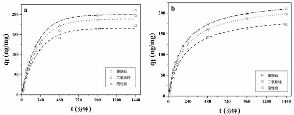 ¡¡¡¡Í¼2£º(a)»ÆÇúù¶¾ËØÔÚ»îÐÔÌ¿ºÍÆäËüÎü¸½¼ÁÉÏÎü¸½µÄÄâÒ»¼¶¶¯Á¦Ñ§Ä£ÐÍÄâºÏÇúÏߺÍ(b)Äâ¶þ¼¶¶¯Á¦Ñ§Ä£ÐÍÄâºÏÇúÏß¡£