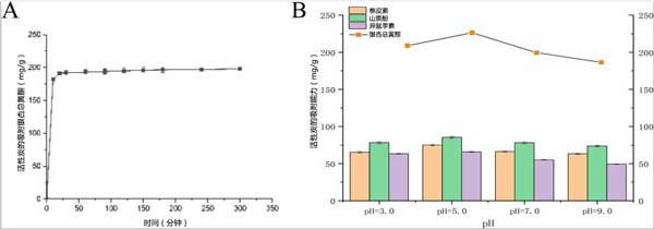 ¡¡¡¡Í¼1£ºÒøÐÓÒ¶ÖÐÒøÐÓ×Ü»ÆÍªµÄ¾²Ì¬Îü¸½ÇúÏß(A)ºÍpH¶Ô»îÐÔÌ¿¾²Ì¬Îü¸½µÄÓ°Ïì(B)¡£