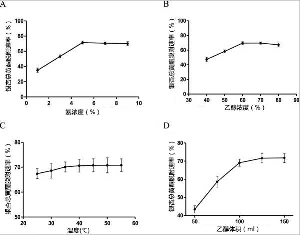 ¡¡¡¡»îÐÔÌ¿Îü¸½ÌáÈ¡ÒøÐÓ×Ü»ÆÍªÖ÷Òª²ÉÓÃÈÈË®ÌáÈ¡ºÍÓлúÈܼÁÌáÈ¡£¬°üÀ¨ÒÒ´¼¡¢¼×´¼ºÍ±ûͪ¡£¿¼Âǵ½ÌáÈ¡ÎïµÄµÃÂÊ¡¢ÌáÈ¡ÈܼÁµÄ³É±¾ÒÔ¼°²úÆ·µÄ°²È«ÐÔ£¬±¾Ñо¿²ÉÓÃÒÒ´¼Ë®ÈÜÒº×÷ΪÌáÈ¡¼Á¡£µ±ÒÒ´¼Ìå»ýŨ¶ÈΪ70%ʱ£¬»îÐÔÌ¿¶ÔÒøÐÓ×Ü»ÆÍªµÄ½âÎüÂÊ´ïµ½×î´óÖµ¡£µ«ÊÇ£¬60%µ½80%Ö®¼äµÄ²¨¶¯·Ç³£Ð¡¡£ÓÉÓÚ»ÆÍªÀ໯ºÏÎïµÄ¼«ÐÔ·¶Î§¹ã£¬´¼ÈÜÐÔºÍË®ÈÜÐÔ»ÆÍªÀ໯ºÏÎïÔÚ70%ÒÒ´¼ÈÜÒºÖеĽâÎüÂʾùÄÜ´ïµ½×î´ó¡£µ±ÒÒ´¼Å¨¶È³¬¹ý70%ʱ£¬»ÆÍªÀ໯ºÏÎïµÄ½âÎüÂÊ»ºÂýϽµ¡£