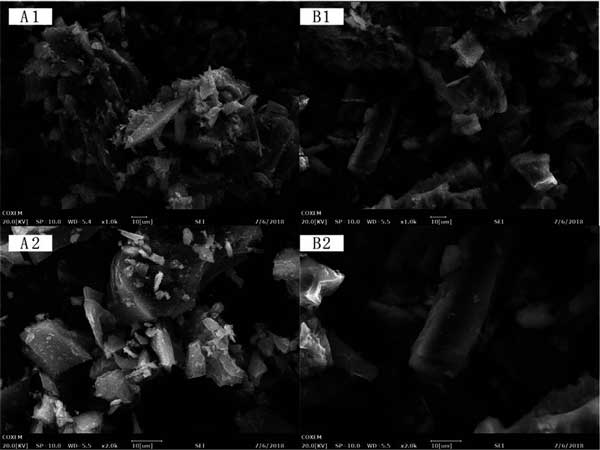 ¡¡¡¡Í¼3£º±»»îÐÔÌ¿Îü¸½ºÍ½âÎüµÄÒøÐÓ×Ü»ÆÍªµÄSEM¡£A1ºÍA2ÊÇÏ´ÍÑǰ²»Í¬·Å´ó±¶ÊýµÄSEMÕÕÆ¬¡£B1ºÍB2ΪϴÍѺó²»Í¬±¶ÂʵÄSEMÕÕÆ¬¡£