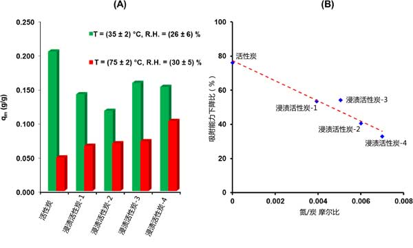 ¡¡¡¡¼×»ùµâÎü¸½ÈÝÁ¿µÄ½µµÍ³Ì¶ÈÈ¡¾öÓÚ»îÐÔÌ¿µÄÐÔÖÊ(ͼ2(A))¡£ÕýÈçÔ¤ÆÚµÄÄÇÑù£¬¶ÔÓÚδ½þ×ÕµÄÎü¸½¼Á¹Û²ìµ½ÓꦵÄÓ°Ï죬ÆäÖнöÒÑÖª²»Éæ¼°CH3IÎü¸½µÄÌØ¶¨Ï໥×÷Ó᣸ü׼ȷµØËµ£¬µ±´Ó»îÐÔÌ¿²ÄÁϵĵÚÒ»×éÌõ¼þ×ªÒÆµ½µÚ¶þ×éÌõ¼þʱ£¬¸ÅÊöÁË´óÔ¼76%µÄÎü¸½ÈÝÁ¿Ï½µ(ͼ2)¡£ÔÚÕâ·½Ãæ£¬ÎªÁ˿˷þÓëË®ÕôÆøºÍζÈÏà¹ØµÄÓ°Ï죬ÈýÒÒ¶þ°·½þ×ÕÊDZز»¿ÉÉٵġ£×î½ü£¬ÓÉÓÚË®¶ÔÈýÒÒ¶þ°··Ö×Ó¾ßÓкÜÇ¿µÄÇ׺ÍÁ¦£¬Òò´ËÈýÒÒ¶þ°·½þ×Õ¿ÉÒÔͨ¹ýÊÍ·ÅÔØÌåµÄ»îÐÔλµãÀ´Ìá¸ß»îÐÔÌ¿µÄ±£ÁôÐÔÄÜ]¡£´ËÍ⣬ÓëÆäËû»úÖÆ(ÓÈÆäÊÇÎïÀíÎü¸½)Ïà±È£¬»¯Ñ§Îü¸½¼×»ùµâµÄ±ÈÀýËæ×ÅζÈÉý¸ß¶øÔö¼Ó¡£È»ºó£¬ÈýÒÒ¶þ°·Óë¼×»ùµâµÄ»¯Ñ§·´Ó¦ÐÔ½«ÔڽϸßζÈÏÂÔöÇ¿¡£µÃµ½µÄ½á¹û(ͼ2)±íÃ÷Ëæ×ŵªº¬Á¿µÄÔö¼Ó£¬ÔÚ“¶ñÁÓÌõ¼þ”ϵı£ÁôÐÔÄÜÖð½¥Ìá¸ß¡£Òò´Ë£¬ÒÔ½þ×ÕÖк¬Á¿×î¸ßÎªÌØÕ÷µÄ»îÐÔÌ¿-4Îü¸½¼ÁµÄÎü¸½ÈÝÁ¿½ö½µµÍÁË33%¡£¸ü׼ȷµØËµ£¬¿ÉÒÔÍÆ¶Ï³öËùÓп¼ÂǵÄÎü¸½¼ÁµÄ¼õÉÙ·ù¶ÈºÍĦ¶û±ÈÖ®¼äµÄ×¼ÏßÐÔ¹ØÏµ(ͼ2B)¡£¸ù¾ÝÕâÖÖ¹ØÏµ£¬ËƺõÐèÒª½þ×Õ£¬ÒÔÈ·±£ÔÚ¸üÑϸñµÄÌõ¼þϸüÀι̵ع̶¨¼×»ùµâ¡£