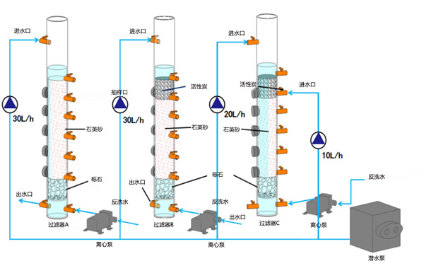 试验装置如图1所示,主体结构采用有机玻璃制成,内径70mm,高度2000mm。过滤器包括进水管、出水管、反冲洗水管、支撑层和过滤介质层。200毫米高的支撑层由砾石制成。粒径为0.5-1mm,和分别为1-2mm,过滤层的填料为石英砂和椰壳活性炭。过滤器A的填料层为1000mm石英砂。过滤器B、C的填料层均为上层200mm椰壳活性炭和下层800mm石英砂。根据水厂的设计规范,过滤器的过滤速度为8m/h,进水流量为30L/h。过滤器A和B为单点进水,过滤器C为两点进水,两个进水点分别位于过滤器顶部和20cm深度处;第一进水点流量为20L/h,第二进水点流量为10L/h。过滤器A和B是过滤器C的空白对照。过滤器每24小时反洗一次。