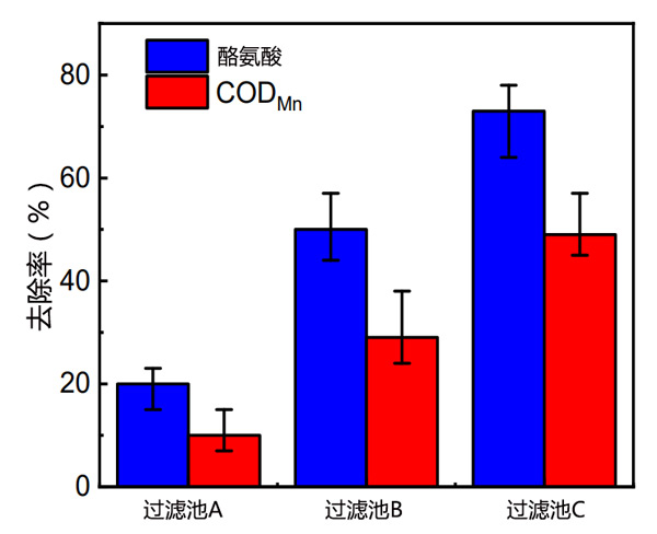 图2:活性炭过滤器流出物中酪氨酸和CODMn的平均去除率。