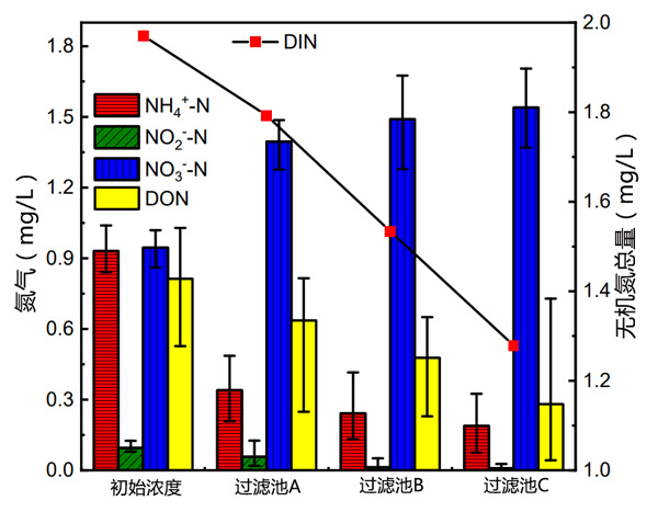 饮用原水中的氮主要以NH4+-N、NO2-N、NO3N和有机氮的形式存在。本实验中的大部分有机氮是酪氨酸。在生物滤池中,溶解无机氮(DIN)和DON是相互转化的,因此有必要讨论活性炭滤池中向氮的转化。进出活性炭滤池的水中氮的变化如图3所示。溶解无机氮损失为活性炭滤池C>B>A(p<0.05),与CODMn的去除率一致。过滤器对有机物的利用随着溶解无机氮损失的增加而增加,表明反应中的溶解无机氮损失现象与过滤器反硝化有关。