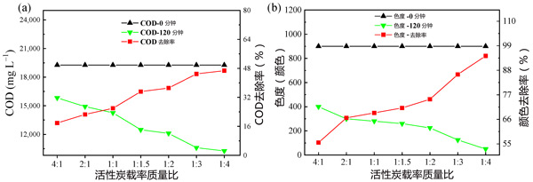 ¡¡¡¡Í¼1£º»îÐÔÌ¿ÔØÂÁÖÊÁ¿±È¶Ô(a)CODºÍ(b)2Сʱɫ¶ÈÈ¥³ýµÄÓ°Ïì¡£